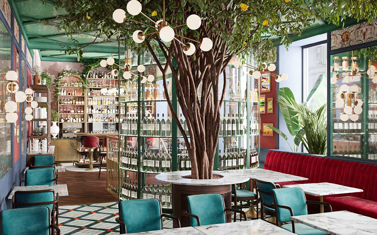 Le lieu continue de dérouler des ambiances tantôt populo, tantôt intimistes. Derrière ce pan vertigineux de spiritueux, un arbre qui grimpe jusqu’au plafond accueille tout autour de lui une dizaine de ripailleurs. En toile de fond, les tapisseries murales bardées de cadres d’époque, affiches anciennes et portraits de famille rendent l’atmosphère exquisément feutrée.